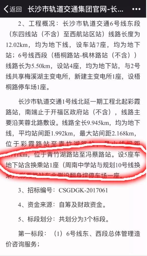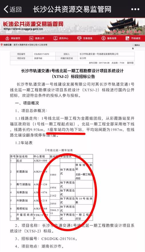 为了证明自己介绍的情况真实可信,业主们提供了相关的文字资料,记者梳理发现,长沙公共资源交易监管网,在今年4月28号,发布了长沙市轨道交通1号线北延一期工程勘察设计项目系统设计(XTSJ-2)标段招标公告,这份公示书的项目概况当中就写明:北延一期工程全部采用地下线,线路长约9.93km,5座车站均为地下站。