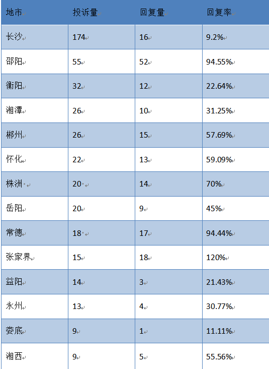 接到投诉后,各市州政府部门均积极介入处理,其中处理较好的市州有邵阳、常德、张家界等,具体回复数据如下表: