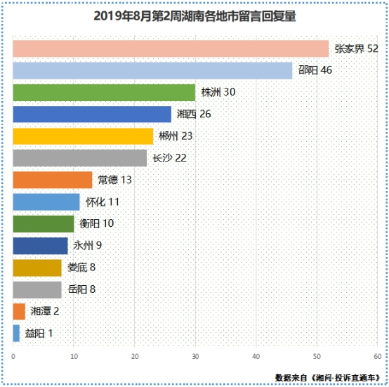 2019年8月第二周,《湘问·投诉直通车》栏目共审发有效投诉1991条,其中省内投诉571条,外省投诉1420条。从地域分布来看,各地市均有涉及,其中,长沙、衡阳、张家界、邵阳、湘西等地网民留言量较多,比较活跃,益阳、娄底、永州、岳阳、湘潭等地网民留言量较少。从相关部门回复办理情况来看,张家界、邵阳、株洲、湘西、郴州等地留言办理积极,办结率高,益阳、湘潭、岳阳、娄底、永州等地留言办理滞后,办结率低。从网民留言话题领域来看,主要集中在交通运输、教育培训、市场监督、城市管理、农业农村等方面。