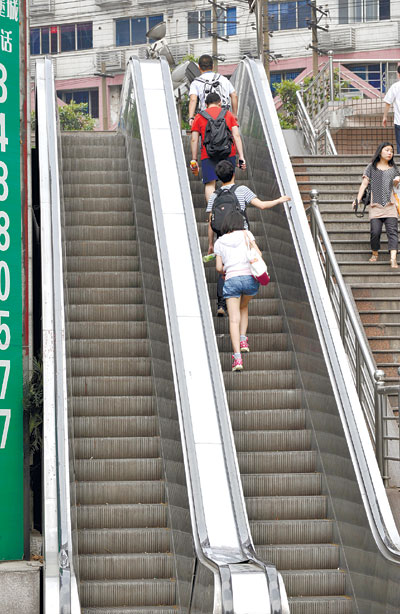 ▲5月8日中午,长沙市定王台,几名行人从这台没有运行的自动扶梯走过。记者 田超 摄