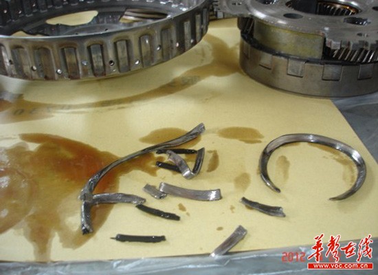余先生的“科鲁兹”小车变速箱拆开后,里面残留大量的金属碎片。