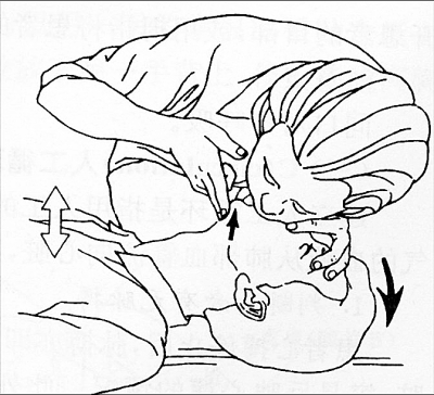 一手向下压住溺水者额头,另一手食指与中指向上抵住溺水者下巴颏,双手同时用力,使溺水者下巴与耳垂连线与地面成90度角(鼻孔朝天),打开溺水者的气道。脸颊贴近溺水者鼻孔,“一听”:耳朵听是否有呼吸的声音;“二看”:眼睛的余光看病患的胸廓是否有起伏;“三感觉”:面颊感觉是否有气流拂面。