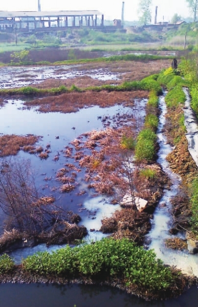 另一个排污点是暗道,地处玻璃厂和焦化厂中间,占田地和鱼塘60亩左右,污水直接排到两个篮球场大小的池塘中,然后在池塘杂草丛生的地段挖一条暗道排污,大量乳白的浑水通过暗道流入周边的农田和蒸水河。