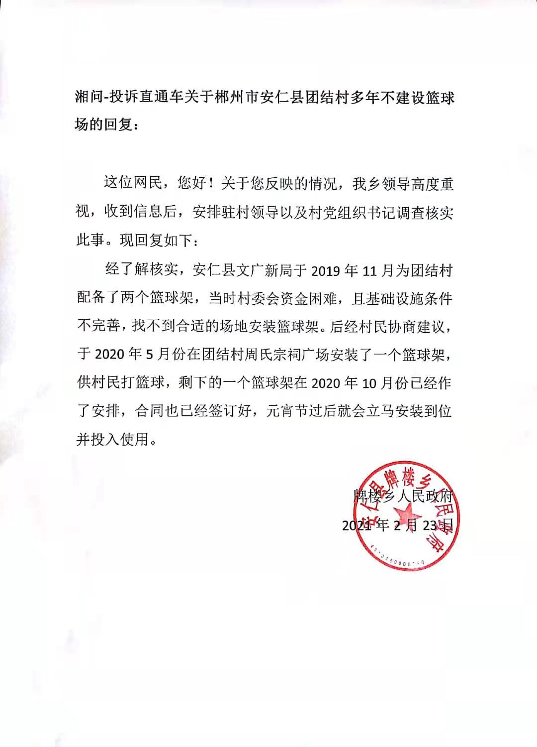 经了解核实,安仁县文广新局于2019年11月为团结村配备了两个篮球架,当时村委会资金困难,且基础设施条件不完善,找不到合适的场地安装篮球架。后经村民协商建议,于2020年5月份在团结村周氏宗祠广场安装了一个篮球架,供村民打篮球,剩下的一个篮球架在2020年10月份已经作了安排,合同也已经签订好,元宵节过后就会立马安装到位并投入使用。