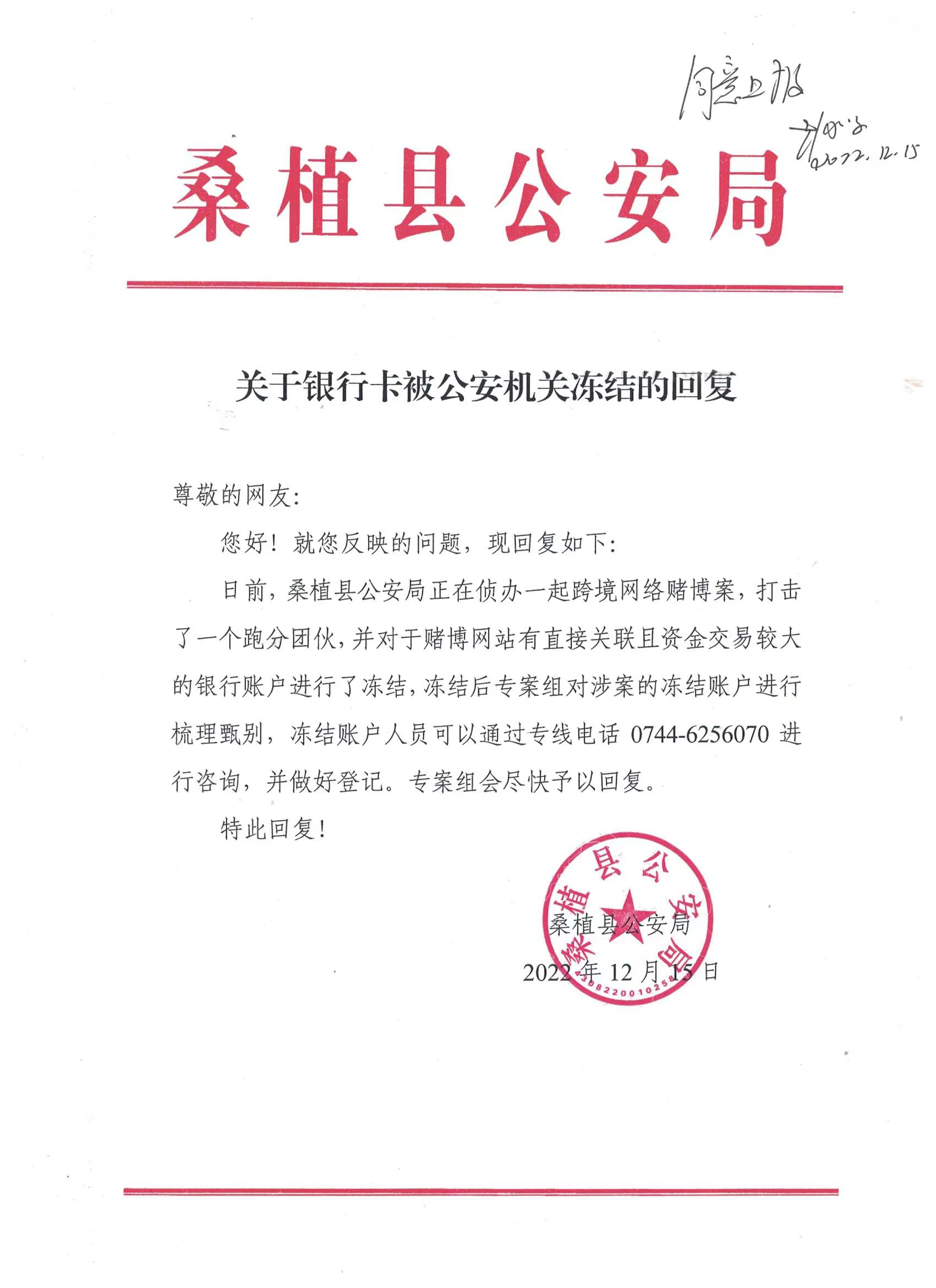 关于“桑植县公安局无故冻结还房贷银行卡”的回复