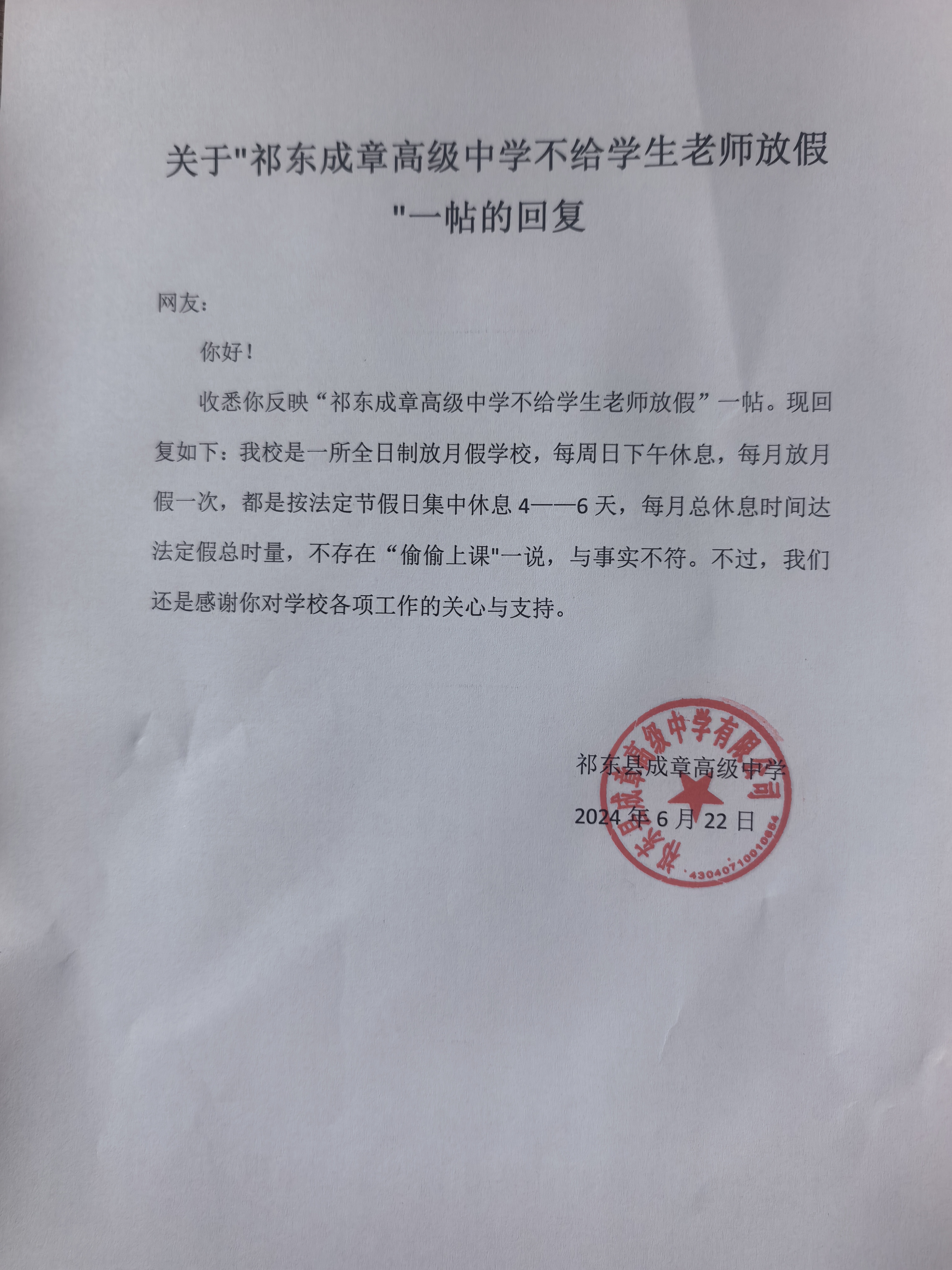去年国庆法定节假日学校只给学生和老师放三天假半,压榨学生及老师的法定节假日,2024年从2月份开学到4月份连续上班两个半月是吧1个半月,中间未曾放假,学生严重压榨学生和老师,老师一天上班长达14小时以上,如今高考在即,高考让老师监考,学考让老师带队,端午又不放假老师,老师在这过程中从未休息,可能上班上到7月中旬,属于严重不合理的放假安排,剥夺了教师休假的权利,还请上级领导严查,这不仅是逼疯老师和学生,危害老师及同学的健康,端午上课就在成章不属于考点的那栋楼偷偷上课,作为成章的老师,没有双休,连单休也没有,现在连月假都没了,还请相关部门领导严查