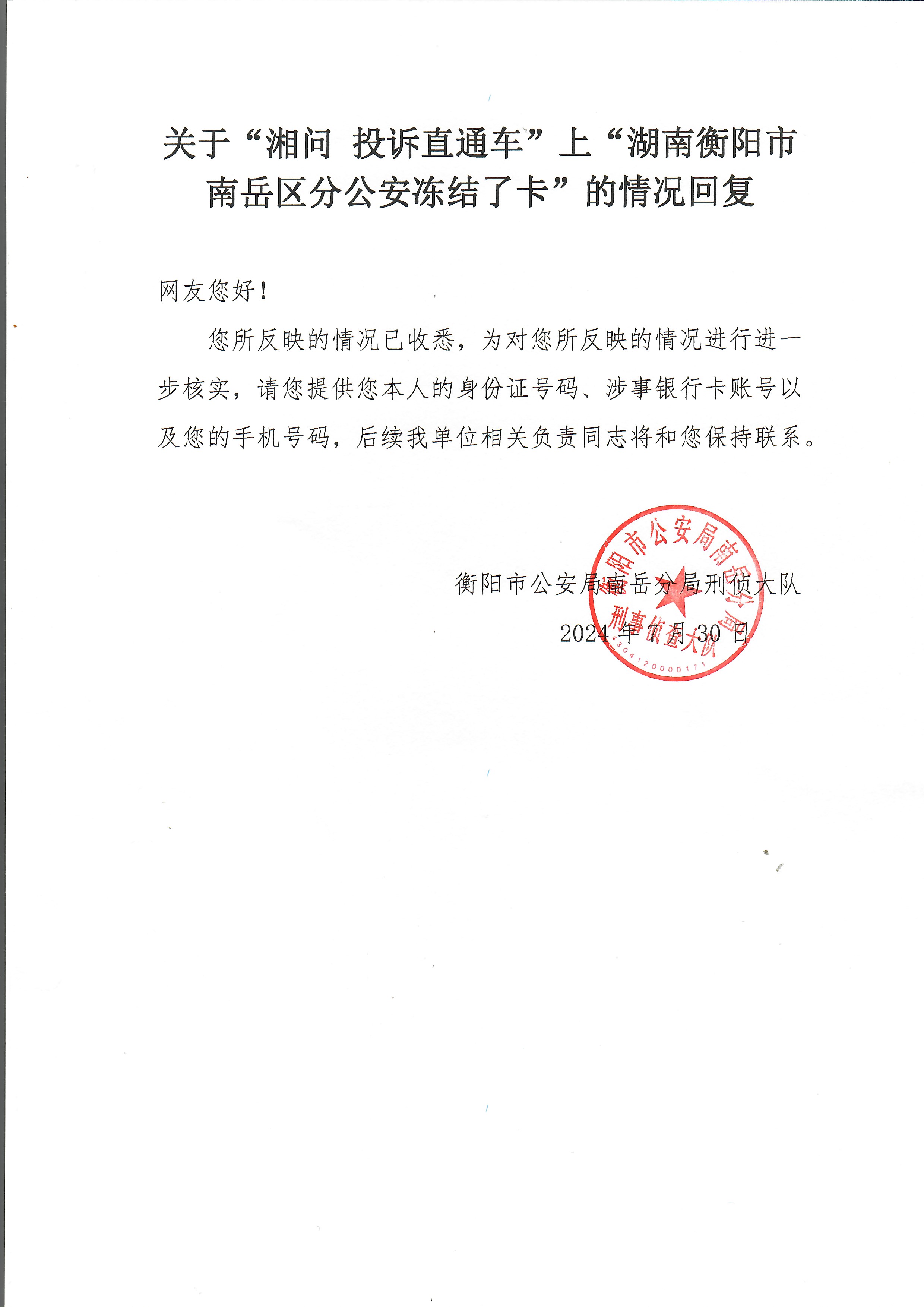 024 -6.19号突然接到一个电话说我的银行卡被冻结 让我自己联系人解决 当时第一时间感觉是骗子 就挂断了电话 后来又一次通话 得知银行卡被湖南衡阳南岳公安分局冻结了 里面本身有几万快钱 是我一家人的收入 电费 生活开支 三个孩子学费都是由这一张卡支出 接到电话去银行查到余额是负数3.8万 顿时感觉天都塌了 然后打110要到了他们分局的电话 经过多次联系 联系上赌博专案小组联系人 说我的流水太大 让我找收货单证明 以前开一家实体孕婴店 后来关闭了 现在已经过去一两年了 去哪里找 明显是故意为难老百姓 说找不到就等法院划扣 天啊 现在JC都这么无法无天了吗?手机被孩子摔坏了 中间还换了手机 然后就说等法院判决 问题是我稀里糊涂的都不知道犯了什么十恶不赦的大罪 假如我以前在不知情的情况下哪里做的不好 可以说出来 我愿意改正 抓网赌我支持 但是要去抓对的人 现在网络时代 手机跳出小广告好多都是害人的 警察叔叔该去管理管理 怎么会有这么多害人的东西出现在手机上 我相信警察叔叔都是保护人民安全的 而不是让最基层的宝妈来兜底 随意大家扣个网赌 洗钱的帽子 人人都说回头是岸 问题是我很确定我没有赌博过 几万块钱对你们来说也许不算钱
