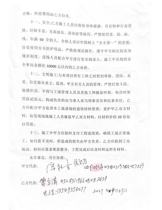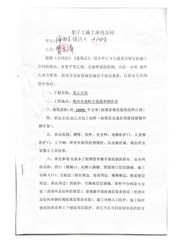 2.架子工刘伟、曹雪生、曹凯等6人不是与我司签的施工合同,而是与开发商负责人傅秋生、侯识万、邓水平签订的施工合同,与我司无关。见附件。