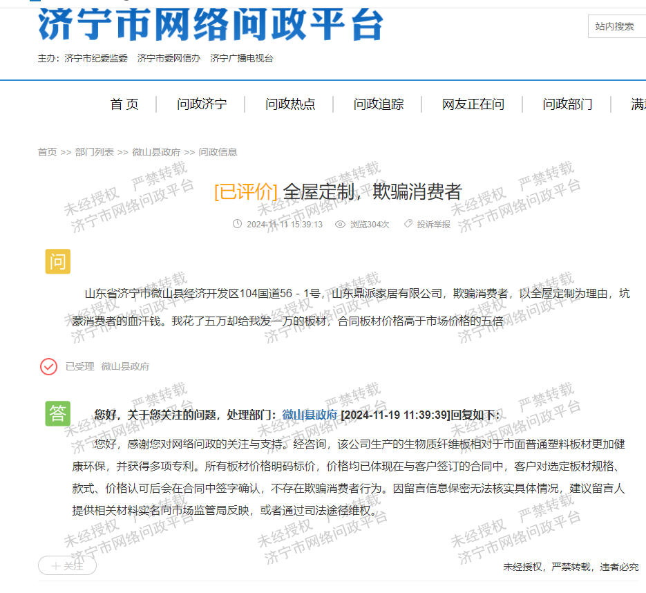 2024年7月份在抖音视频里面看到房屋定制整装广告,于是留下联系方式,隔天济宁市微山县山东鼎派家居有限公司业务员就联系我,说全屋定制整装样品房在六万左右,经过我们详细了解,最终以59000元谈好全屋定制整装样品房给他们公司宣传一年,他们公司答应送软装12800元,施工补贴3000元,于是我就和他们签订了合同,我先交定金2000元量房,后续共付款50000元,等装修完房子付尾款9000元,协商后签订合同,定制整装板材,板材到货后第一时间联系山东鼎派家居有限公司业务经理,他们公司说让我们自己在当地找木工安装师傅,安装费让自己出,我觉着这不是全屋定制整装了,有点疑心,总共安装费花了16000元,我就忍忍过去了,结果到量橱柜衣柜鞋柜门的时候,他们给我发了一份报价表,让我在补交35000元才能定制方案,于是产生纠纷,一开始就是样品房全屋定制整装,后续怎么还让自己出钱,他们经理说,那是预估款6万,我就说你们的预估也太大了吧,他们说没办法只能按合同办事,结果才知道被他们公司算计了。我要求退款他们公司就说退款可以,你现在交了五万,用去板材木饰面45000元多,剩下的可以退,于是我在当地问了好多家公司,市场价格20-25元一平方的木饰面山东鼎派家居有限公司卖给消费者138元一平方。高于市场价格的4-5被之多。这不是明明欺骗消费者吗?希望有关部门重视,严查山东鼎派家居有限公司,严惩不贷,还消费者一个公道,维护消费者权益,谢谢