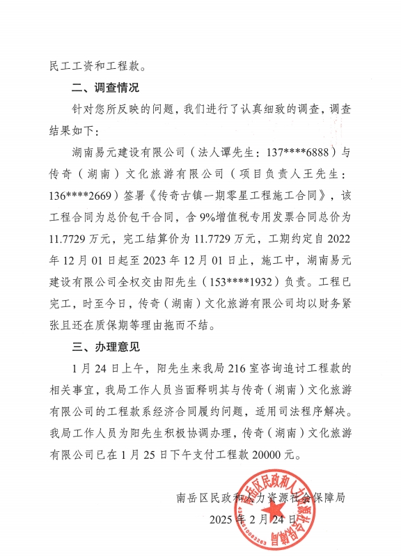 关于传奇(湖南)文化旅游有限公司恶意拖欠民工工资和工程款的情况反映