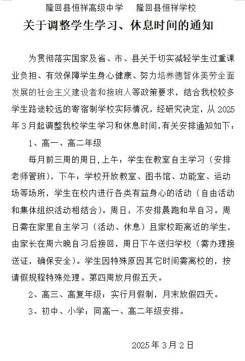 由于国家政策高中生实行双休政策,隆回一中及六中等公办学校都积极跟着国家走,都实行了双休政策为什么恒祥没有?