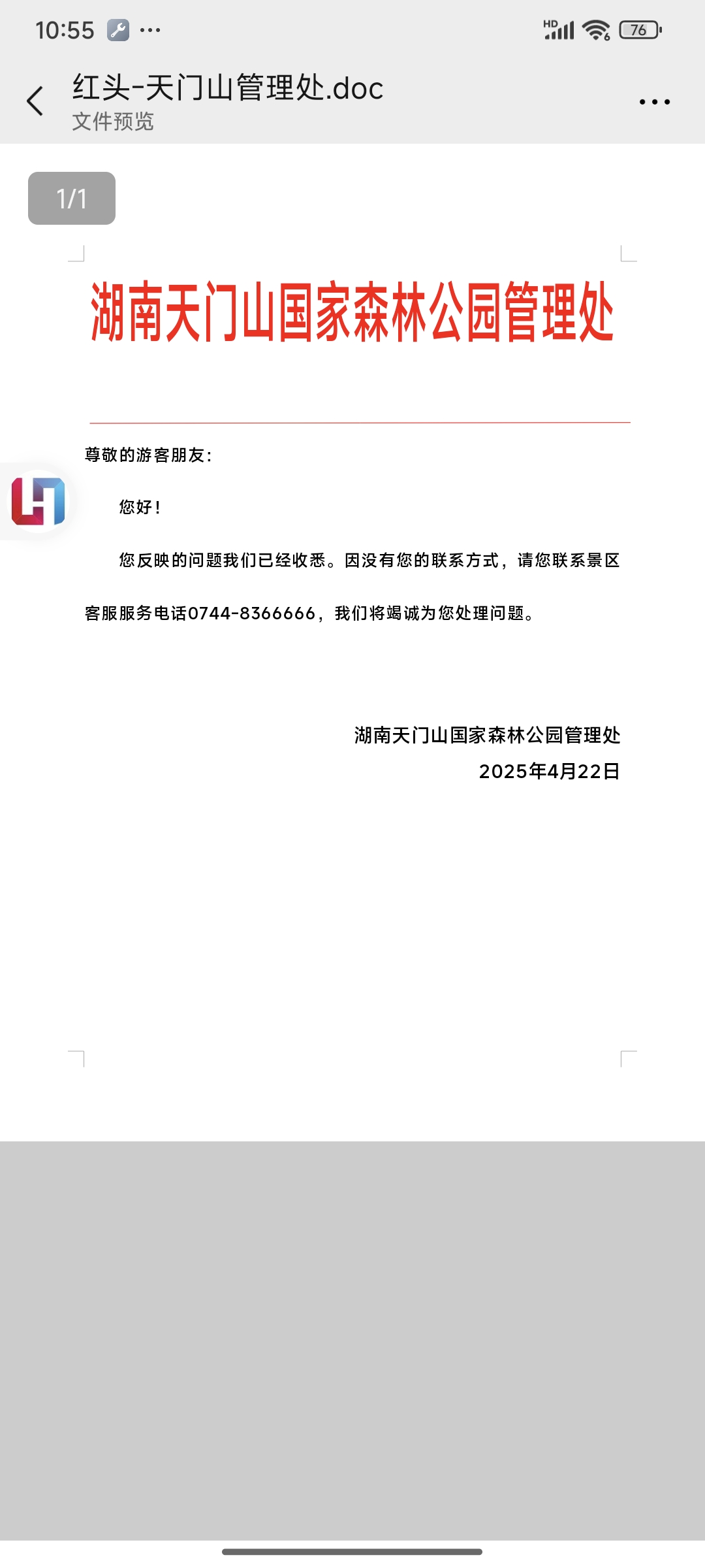 你的投诉的问题我们已经知晓,请您与天门山公司联系,一定会给您妥善处理!