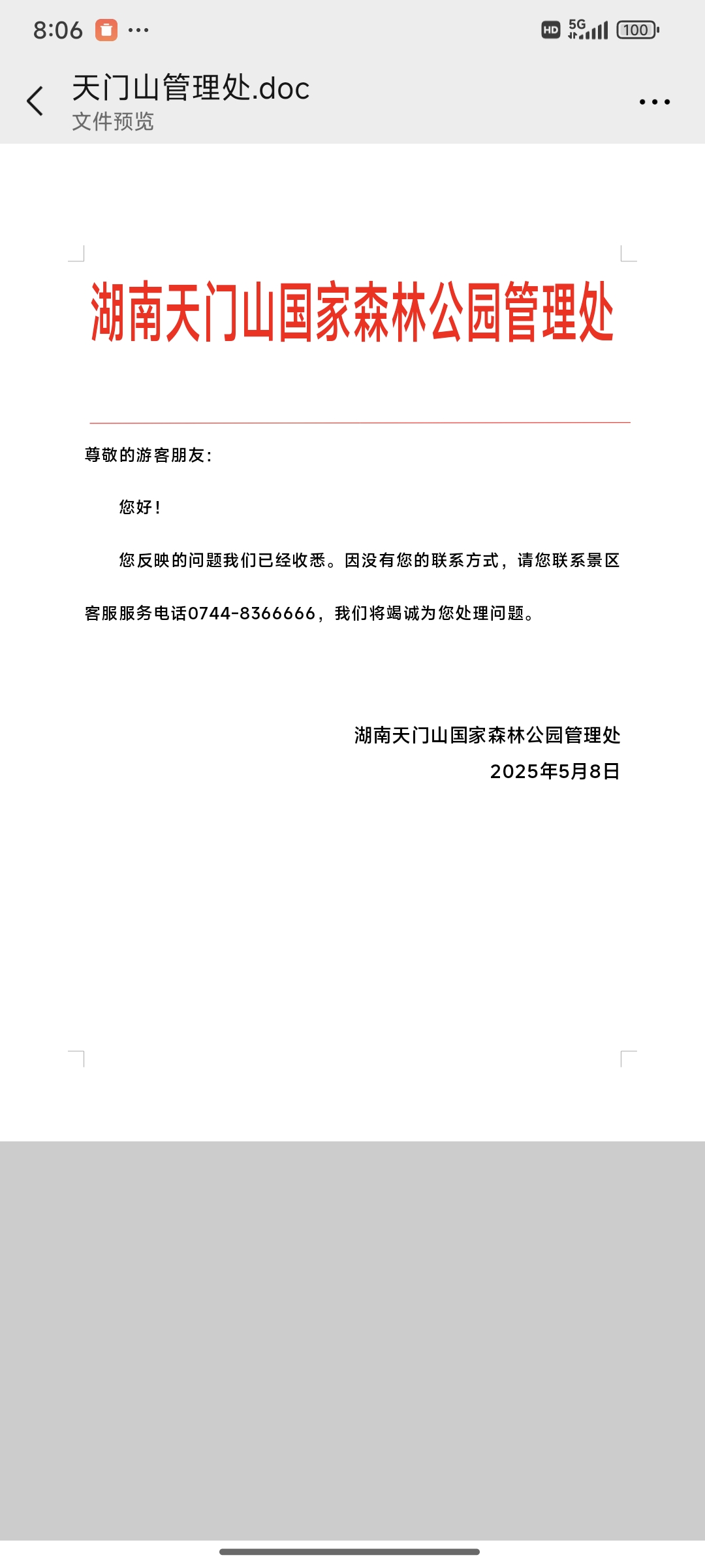 你的投诉的问题我们已经知晓,请您与天门山公司联系,一定会给您妥善处理!
