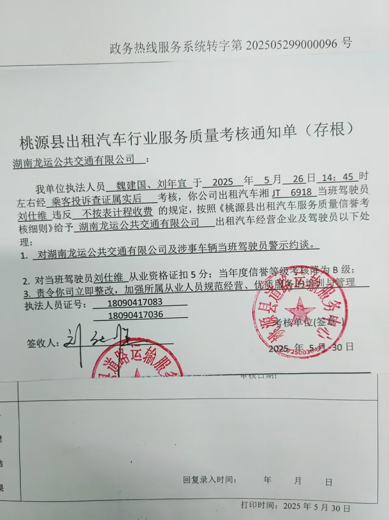 下一步,我局将进一步加强打非治违的力度,发现一起严肃处理一起。如您在桃源县乘车遇违法、违规经营的巡游出租车或网约车权益受到侵害时,请保留相关付款图片和乘车信息等证据,及时拨打举报电话0736-6629668、0736-6622877。我们将及时维护您的合法权益。