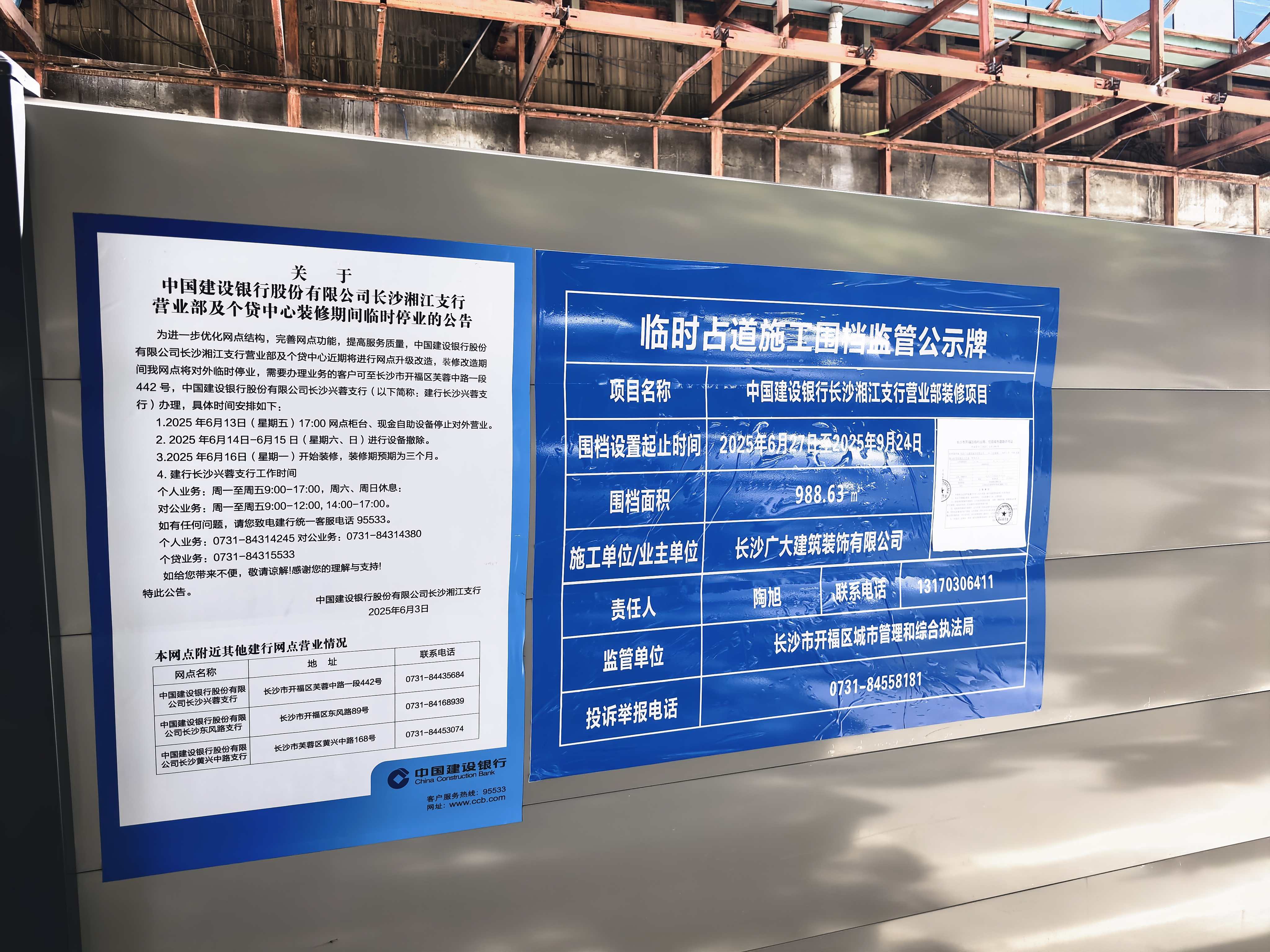 建设银行长沙湘江支行营业部装修施工,围挡占了一半的人行道,加上路边的违停车辆,最窄处仅容一人侧身而过。公示牌上显示装修还需三个月,严重影响行人通行安全,希望有关部门介入,保障行人安全通行。