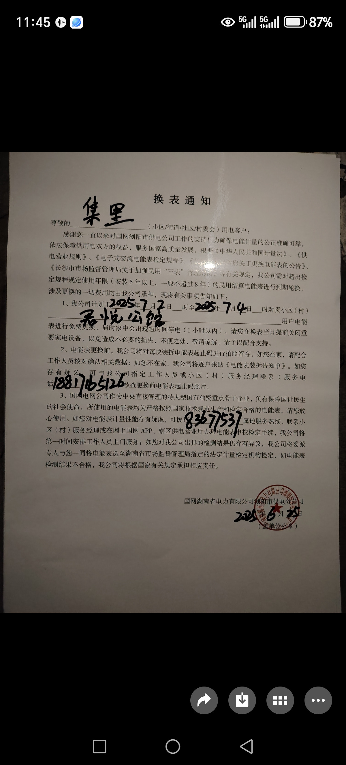 本次表计轮换工作供电公司已提前发送告知短信至所有涉及客户,并在小区的公告栏、电梯口等显著位置提前张贴更换告知书,并协同物业、社区负责人员同步通过微信群方式进行通知。