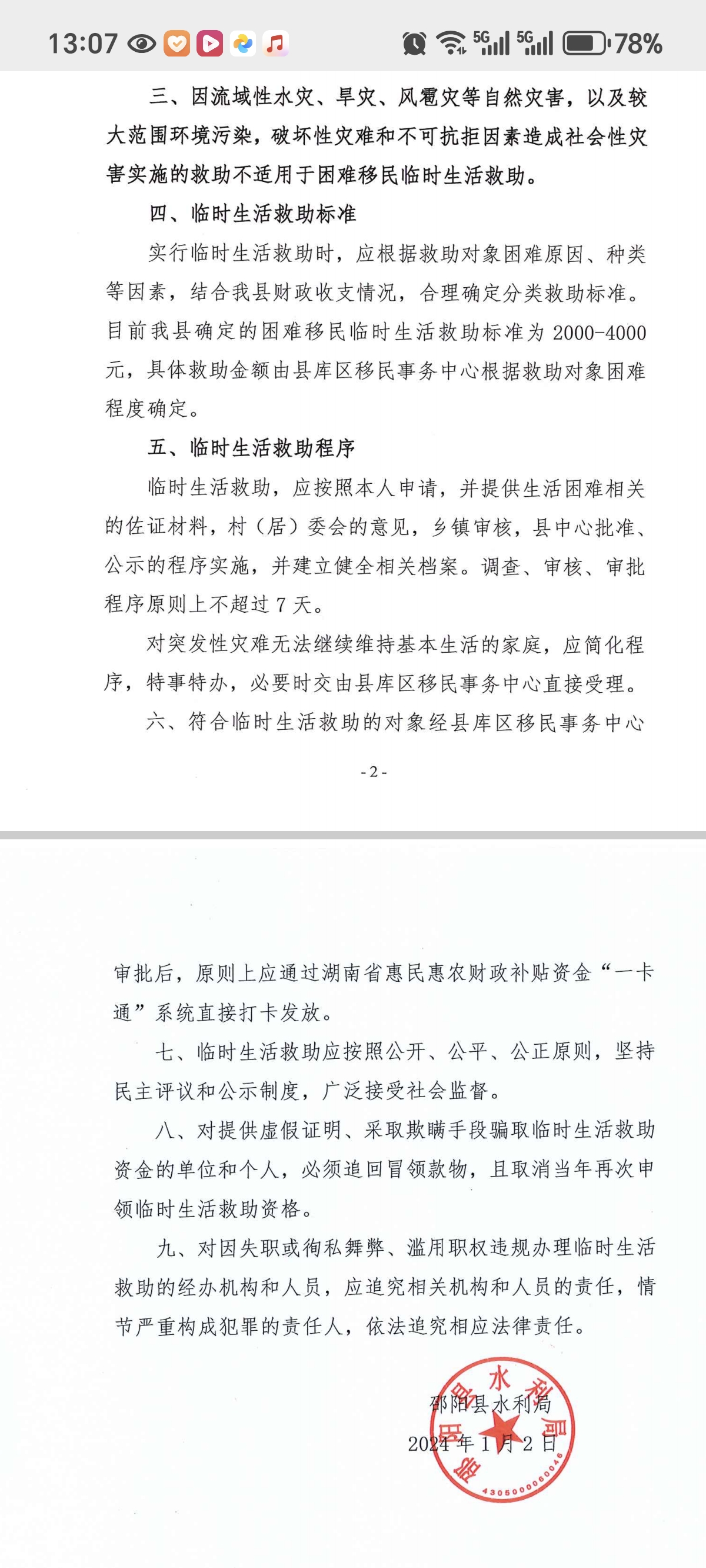 经查,为帮助水库特困移民解决生活困难问题,邵阳县水利局于2024年1月2日下发《邵阳县特困移民临时生活救助实施办法》(邵水发字【2024】18号)文件,如您的情况符合该文件相关规定,请按文件要求进行申报,文件见上传附件。