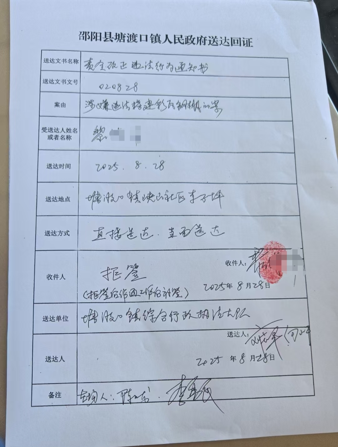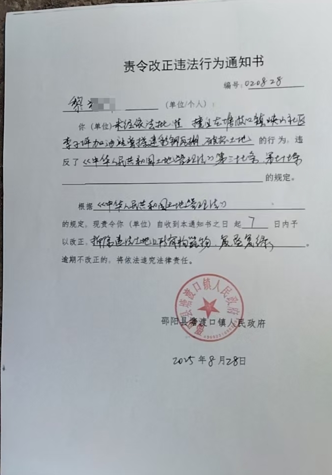 经过实地走访,您反映的黎某华系峡山社区李子坪原始居民,该房屋于2006年建成。房屋前坪的棚子为2018年搭建。由于当时妇幼保健院建设打桩的影响,导致该房屋墙体及屋顶开裂漏水,2023年房主在房屋楼顶搭建棚子防水隔热。接到您的反映后,我镇执法大队于8月28日上午到现场与黎某华进行沟通,并对他发出《责令整改违法行为通知书》,要求其限期拆除房屋前坪的违建瓦棚。