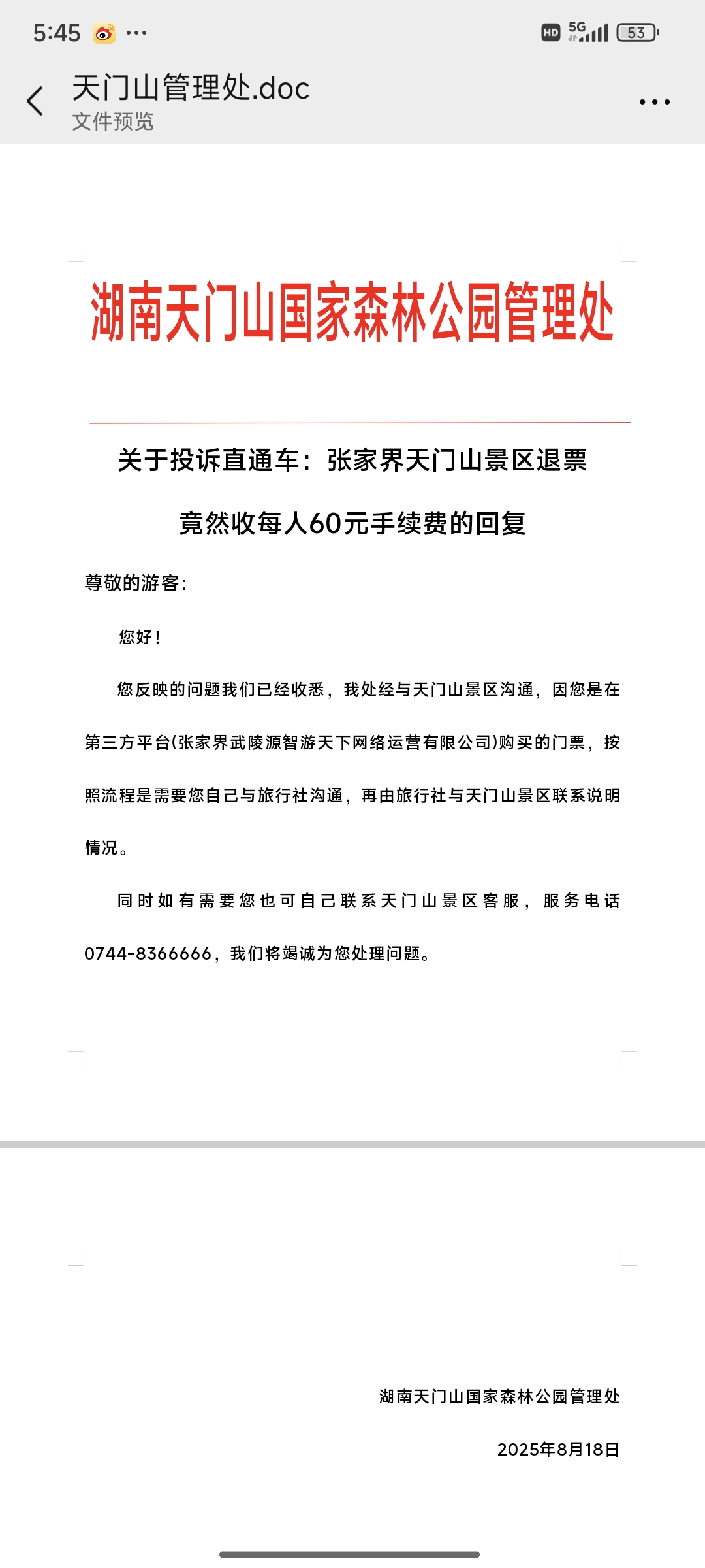 您投诉的问题我们已经知晓,我处已经与天门山景区沟通,且已给出处理方式见附件,一定会给您满意的答复!