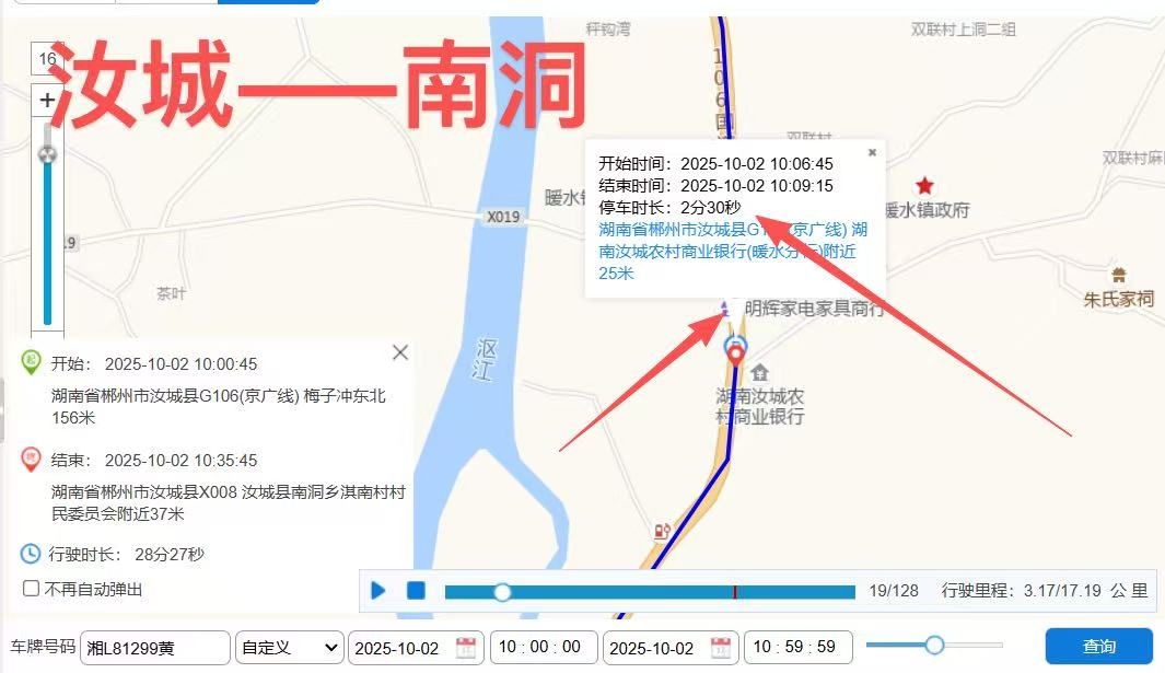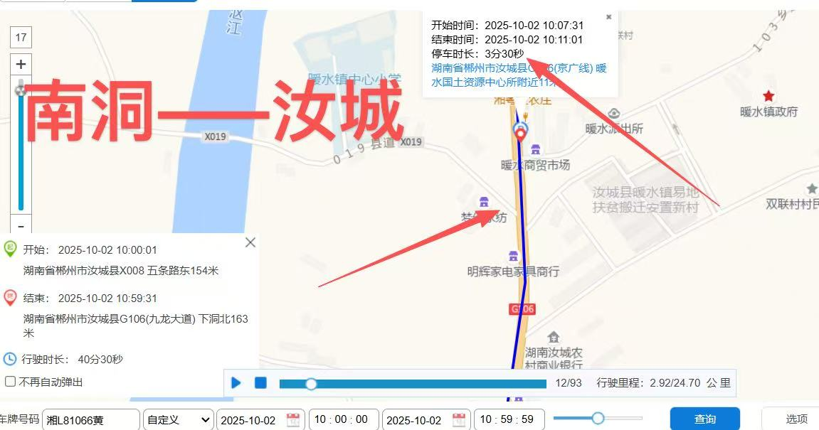 3、南洞至汝城湘L81066,在10.07-10.11分停靠了3分30秒。(见停靠轨迹图)