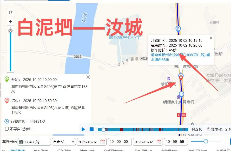2、白泥坳至汝城湘LC8488,在10.19-10.20分停靠了45秒。(见停靠轨迹图)