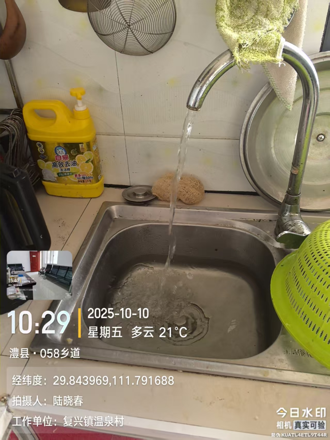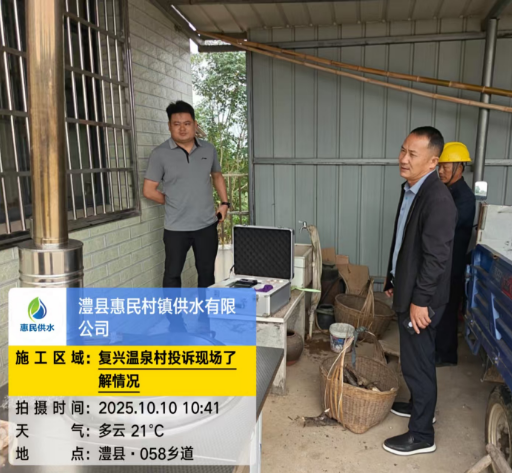 2.用户用水情况。因该用户是匿名投诉,无法查看其家中水质水压,调查走访人员只能根据该投诉人所说的范围去现场查看其他用户用水情况,并与居民当面沟通了解现阶段温泉村的供水现状,居民表示目前水质无论是色度、浊度、pH值、余氯等均符合生活饮用水标准,没有发现水质发黄、浑浊等异常情况,表示满意和理解,。(后附实地走访图片)。