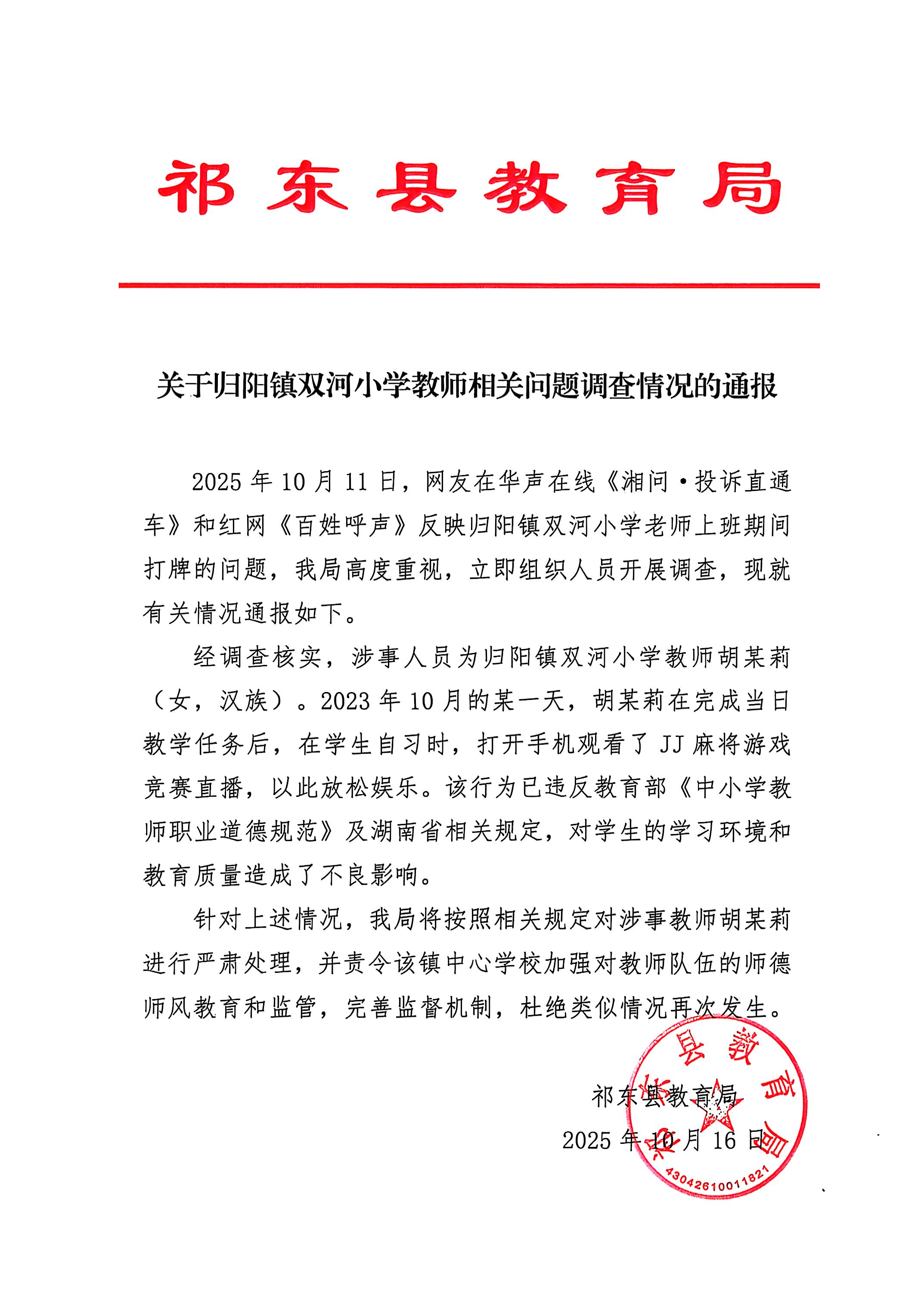 1.归阳镇双河小学教师胡*莉,在上班期间上课教师打牌