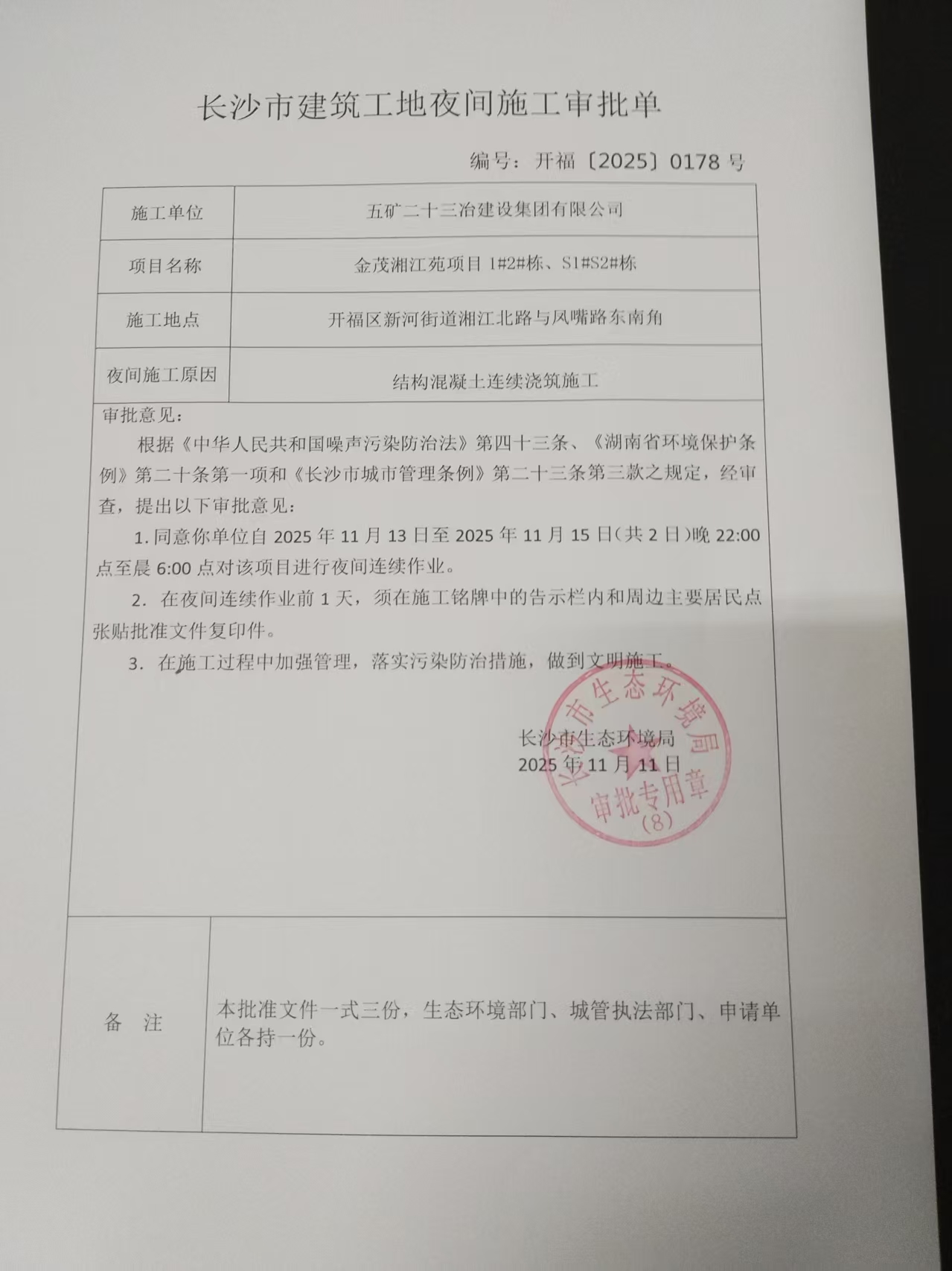 接到该处投诉后,开福区城市管理和综合执法局新河中队执法人员立即赶赴现场调查。经查,您投诉的位置是开福区新河街道五水厂附近,经执法人员检查发现此工地正在水泥浆浇灌楼面,工地方提供了长沙市建筑工地夜间施工审批单、编号:开福(2025)0178号,执法人员要求其降低施工噪音,确保不影响周边居民的休息。