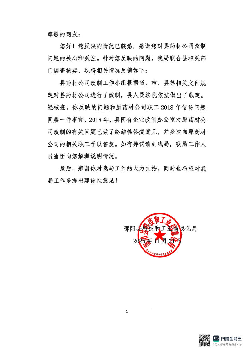 您好!您反映的情况已获悉,感谢您对县药材公司改制问题的关心和关注。针对您反映的问题,我局联合县相关部门调查核实,现将相关情况反馈如下: