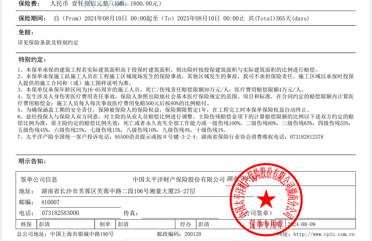1、投保人罗忠在中国太平洋财产保险股份有限公司湖南分公司投保的自建房建设工程安全生产责任保险(保险单号: ACHS00G1NK24FN000030)索赔事宜,我公司已对接处理。经核实保险情况(见附件截图),本次事故涉及两个险种赔偿,其一是医疗费用责任保险(限额40000元);其二是人员伤亡责任保险(限额300000元)。