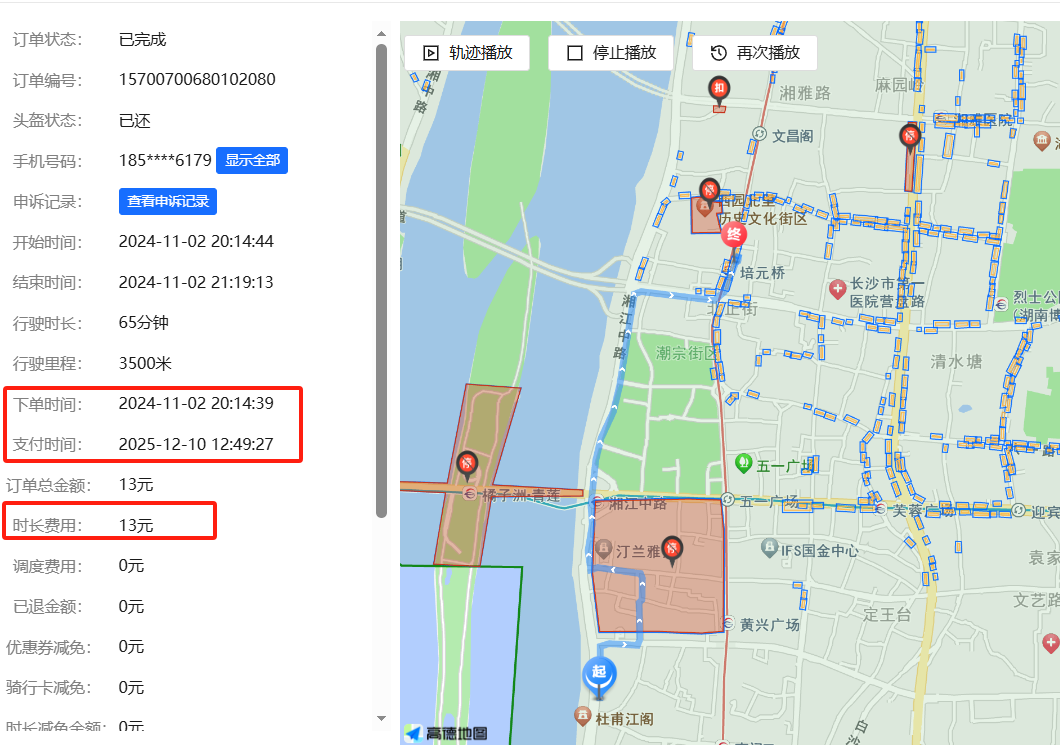 非常抱歉给您带来不便,请用户查询行程订单费用及充值记录。共享电动车先骑后付,不会自动扣款。您在2025-12-10 再次使用小程序时提醒您有一笔待支付订单。该订单开始时间:2024-11-02 20:14:44,付款时间:2025-12-10 12:49:27,有正常的长距离骑行轨迹,如有疑问可以致电客服电话:400-900-6966客服咨询,感谢使用及反馈。