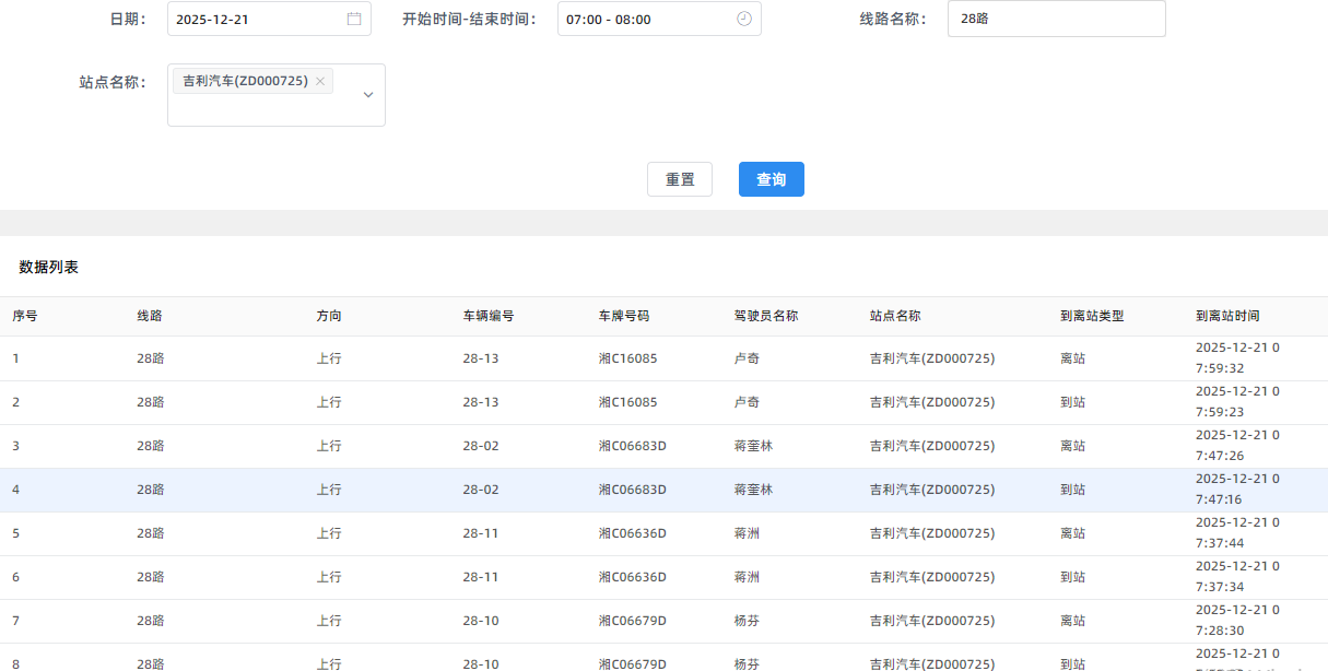 2、由于您未能提供具体的乘坐时间以及乘坐上下行的方向,无法调取28路吉利汽车公交站台的到站情况视频。经调取12月21日28路早晚高峰期营运车辆到离站信息,吉利公交站站点均正常停靠。