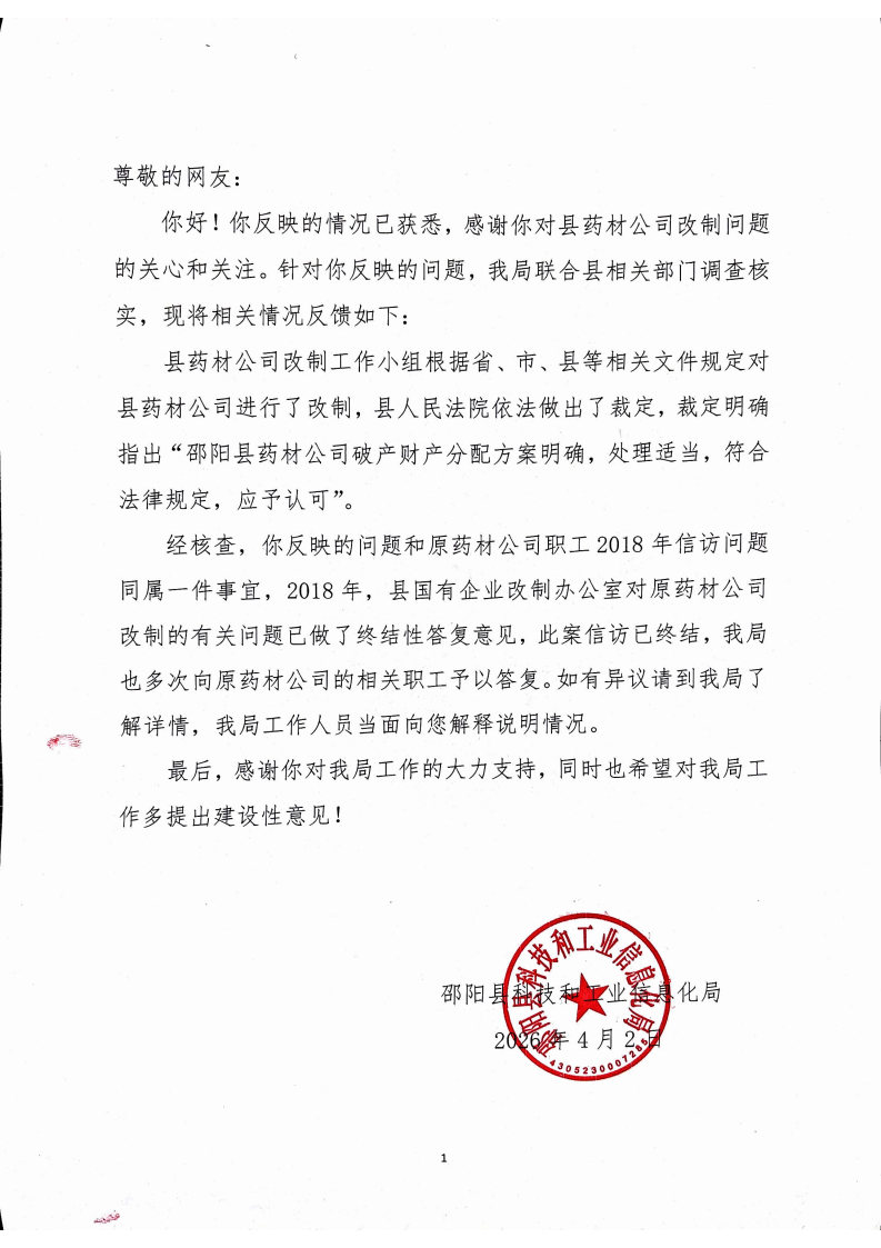 你好!你反映的情况已获悉,感谢你对县药材公司改制问题的关心和关注。针对你反映的问题,我局联合县相关部门调查核实,现将相关情况反馈如下: