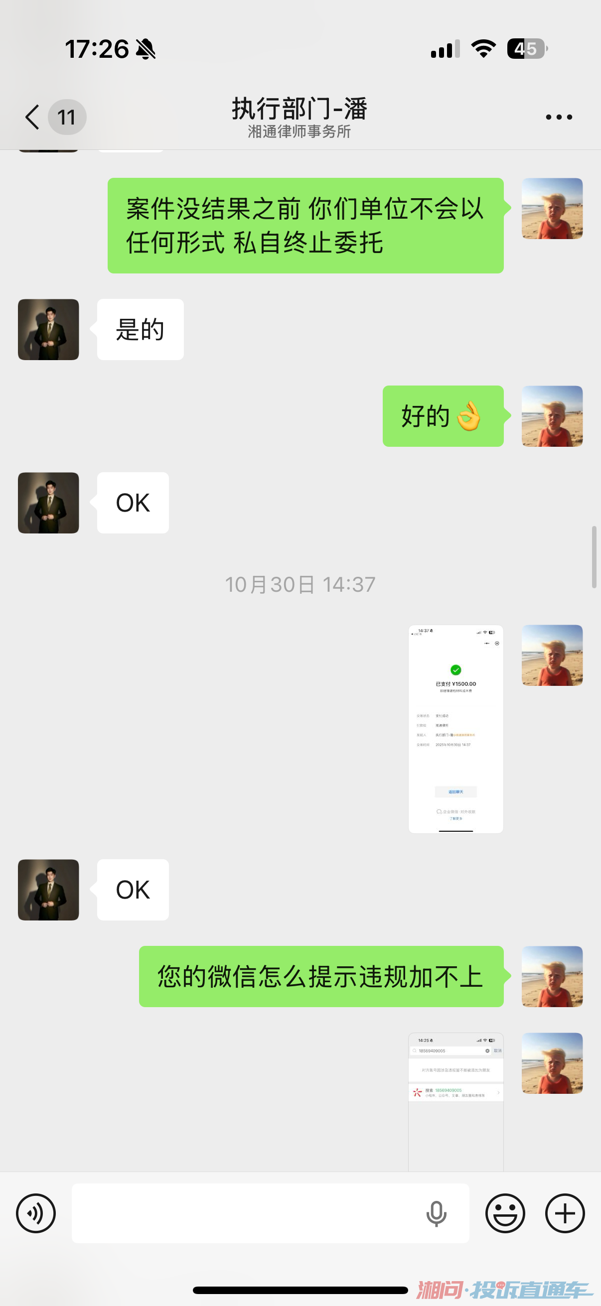 湖南湘通律师事务所通过微信平台推送 虚假宣传 收钱不办事 多次诱导我交钱帮我追回款项 起初由一个企业认证微信该律所认证名字件潘旭的人对接我 说全权代理我的案子前期收取1500的启动费用 中途不收取任何额外费用 直到追会款项从中收取百分之6的佣金 说他们有自己的执行方案完全不用我管 只需要等待对方主动还钱 必须案子保证案子处理到结果再终止协议 结果交完钱这个潘旭就彻底联系不上了,拉了一个群给我,里面没有任何正规律师于我对接也没有任何电话联系方式,只有所谓助理售后答非所问并且经常不回复我消息,一直拖延两个月只给我打印几张纸让我签字寄到法院...