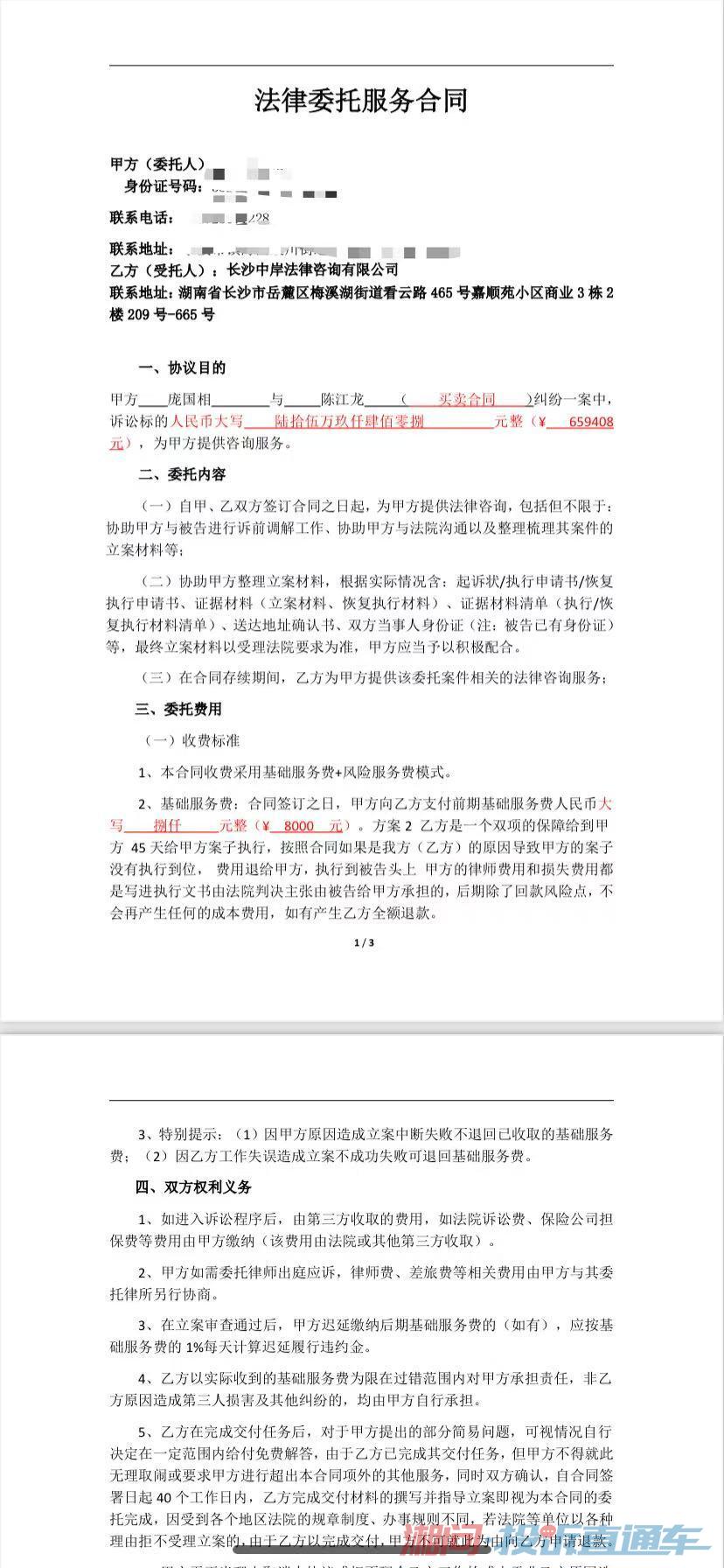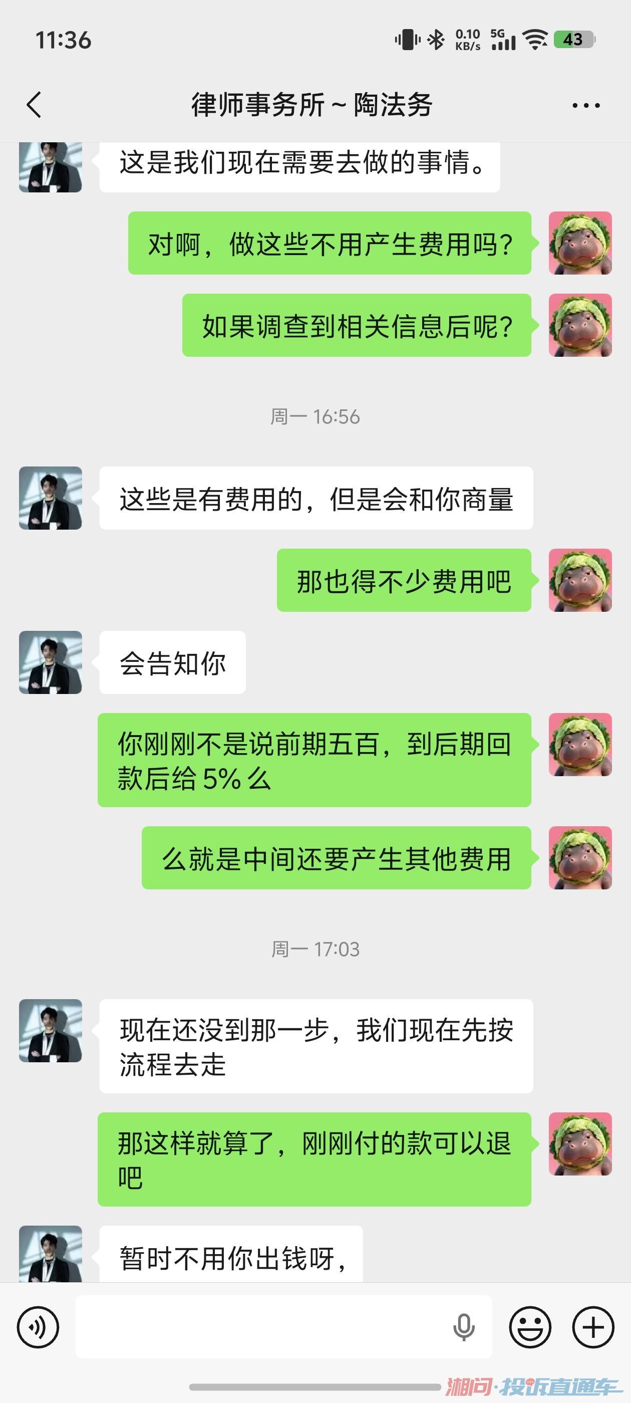 我叫庞国相是一个六十多岁的老人,2025年5月我被中岸法务公司一个姓魏的收了3280说让湖南湘通律所的律师去给我处理案子,第二天一个姓康熙的联系又收了8000块钱,自称45天能执行回款没回款就退,后面没有音信,诉求全额退款。