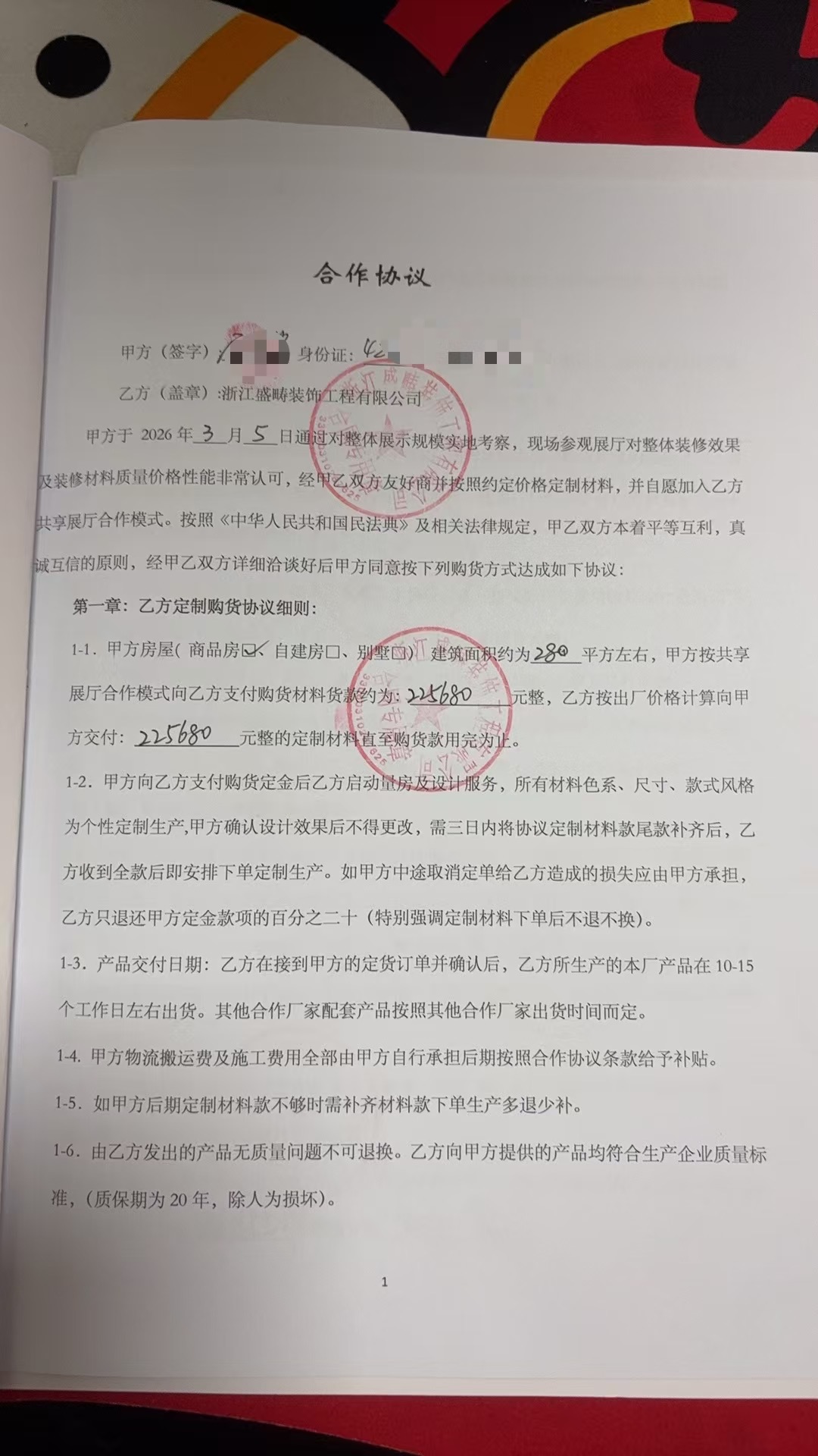 本人在视频号看到有在直播间说全屋整装几万块就能装好1套房子,留了联系电话,周经理的联系了我,我跟他说了我房子面积后他说大约每套8万左右,叫我去看样板房,去到工厂有一个姓周的总监带我们参观样板房,我总共有三套,一共280平,最终谈好按建筑面积算,总价是225680元全包,谈好做样板间折后是183680千元,还说拎包入住,已付款183680,自己做了水电预埋,我们自己承担剩下的当时周经理诺按效果图全包,像效果图一样1比1还原(有录音为证)包刮天花板,墙,柜子,厨房门,洁具,家电,家具等等,效果图看到的东西全部包含,结果,现场只送了天华及墙...