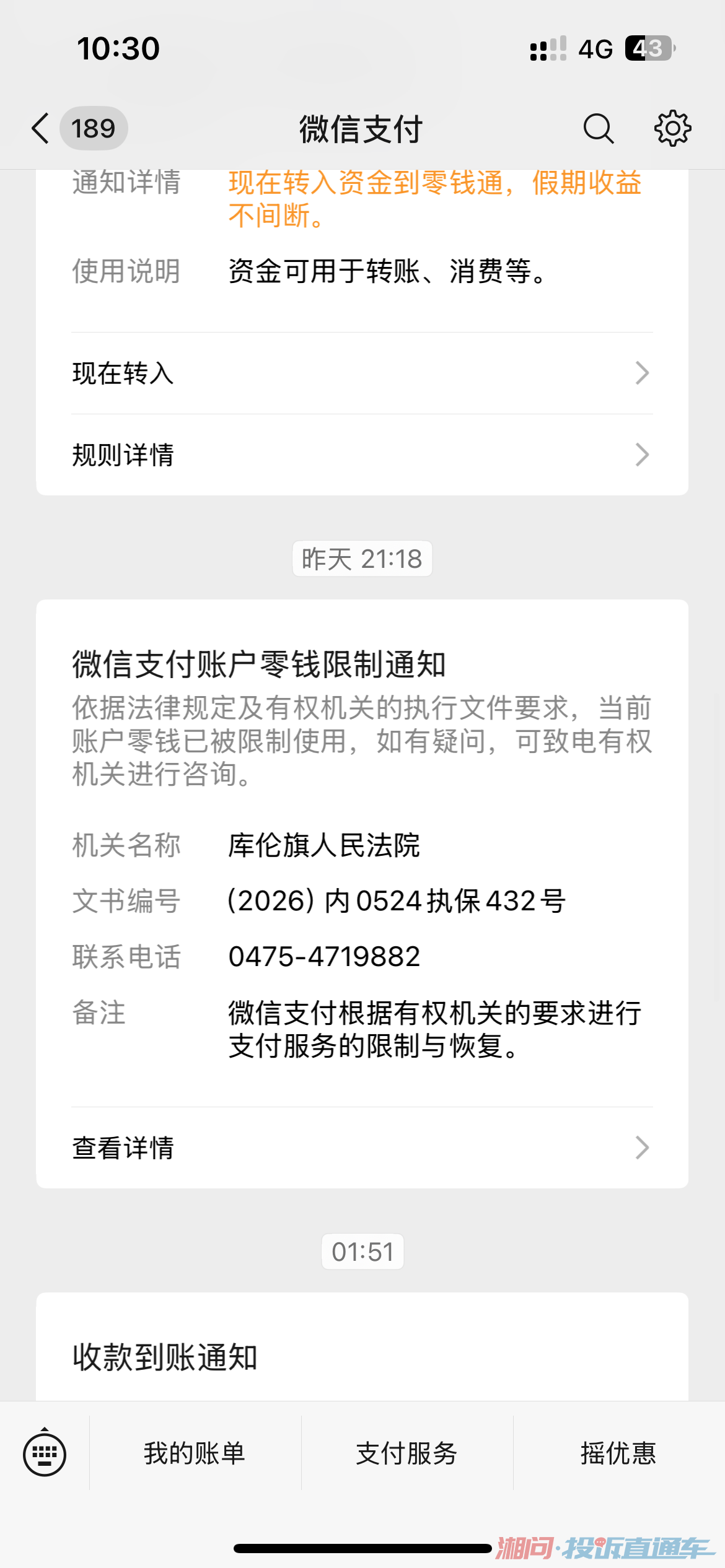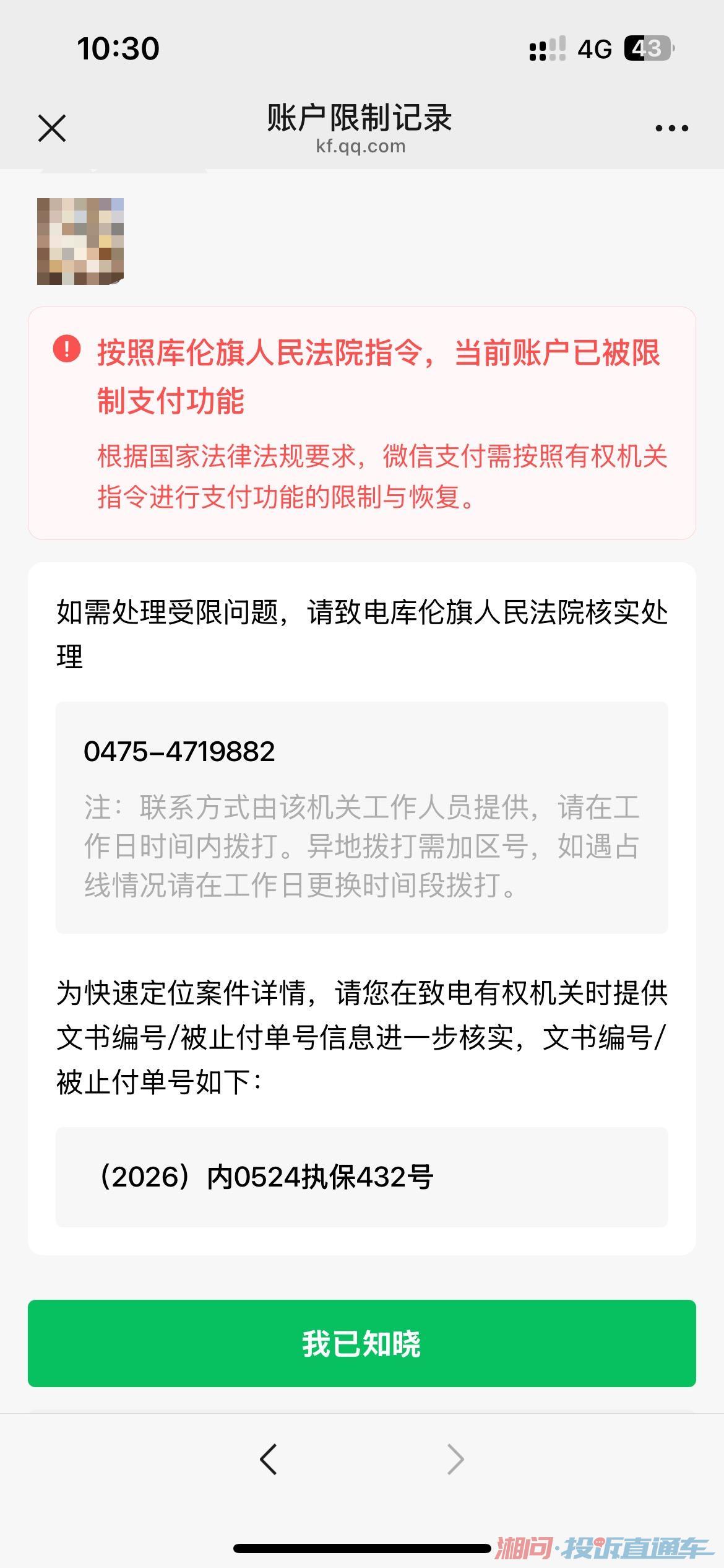 投诉对象:内蒙古库伦旗人民法院案号:(2026)内0524执保432号投诉事由:1. 本人未收到裁定书即被冻结:本人于2026年3月31日发现微信零钱支付功能被贵院冻结,但至今未收到任何保全裁定书(书面或电子版均未收到),贵院未依法履行送达义务。2. 线上查不到案件信息:本人通过“人民法院在线服务”小程序和“阳光执行”平台查询,均未查到该案任何保全文书或案件信息。3. 法院无管辖权:本人常住地为江苏省镇江市,不在内蒙古通辽市库伦旗。根据《民事诉讼法》第二十二条,贵院对本案不具有管辖权。4. 法院电话长期打不通后竟转催收公司,催收公司冒...